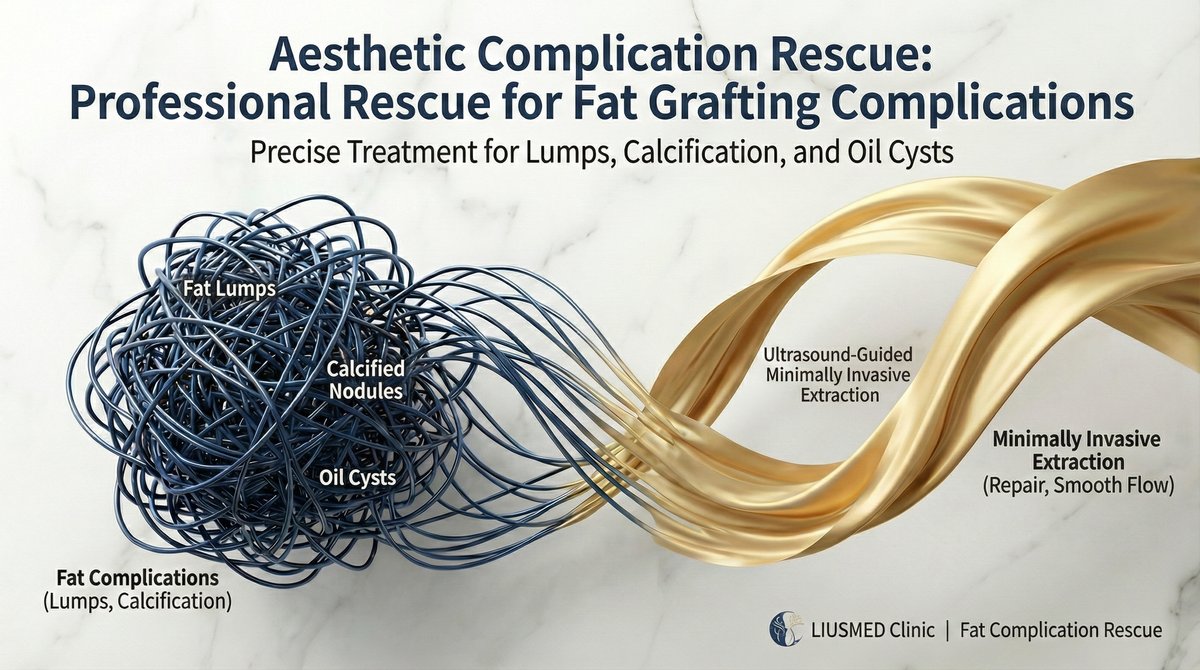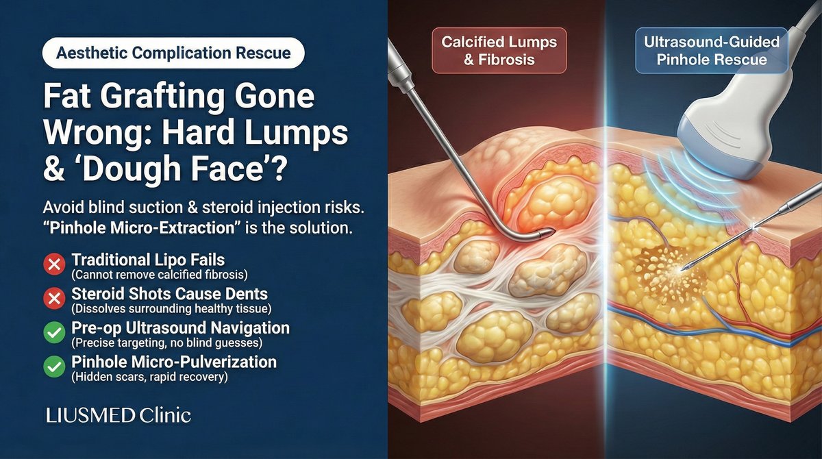 Although fat grafting uses your own tissue, complications can be equally challenging — facial overfilling syndrome (FOS), calcified lumps, and under-eye fat granulomas (caterpillar-like bumps) are problems that traditional liposuction or steroid injections often cannot resolve. Dr. Liu at Liusmed Clinic specializes in ultrasound-guided "Micro-Pinhole Extraction," precisely removing fibrotic fat masses through just 1-2mm micro-incisions, restoring natural contours without major surgery.