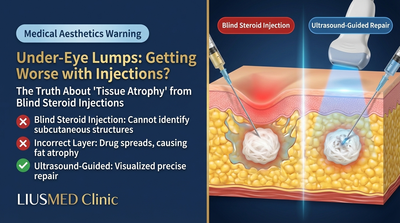 エランセの目元注射で結節が発生した場合、盲目的なステロイド注射は薬剤が正常な脂肪層に浸透し、重度の組織萎縮と陥凹を引き起こす可能性があります。劉医師は眼窩周囲の修復には超音波ガイド下の可視化治療が必要であること、初回治療には可逆的なヒアルロン酸による滑らかで腫れない涙袋テクニックを優先すべきであることを強調します。