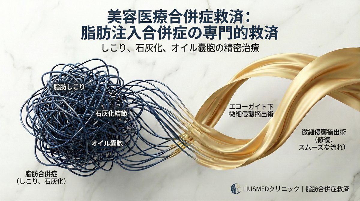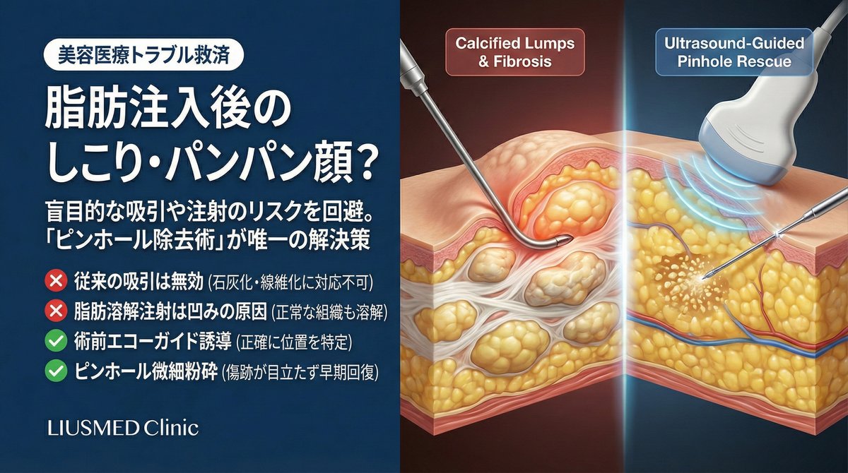 自家脂肪移植は自身の組織を使用しますが、合併症も同様に厄介です——饅頭化(FOS)、石灰化硬結、目の下の脂肪肉芽腫(毛虫状の突起)などの問題は、従来の脂肪吸引やステロイド注射では解決できないことが多いです。麗式クリニックのリュウ先生は超音波ガイド下「針孔微創摘出術」を専門とし、わずか1-2mmの微創傷口から線維化した脂肪塊を精密に除去し、大きな切開なしで自然な輪郭を回復します。