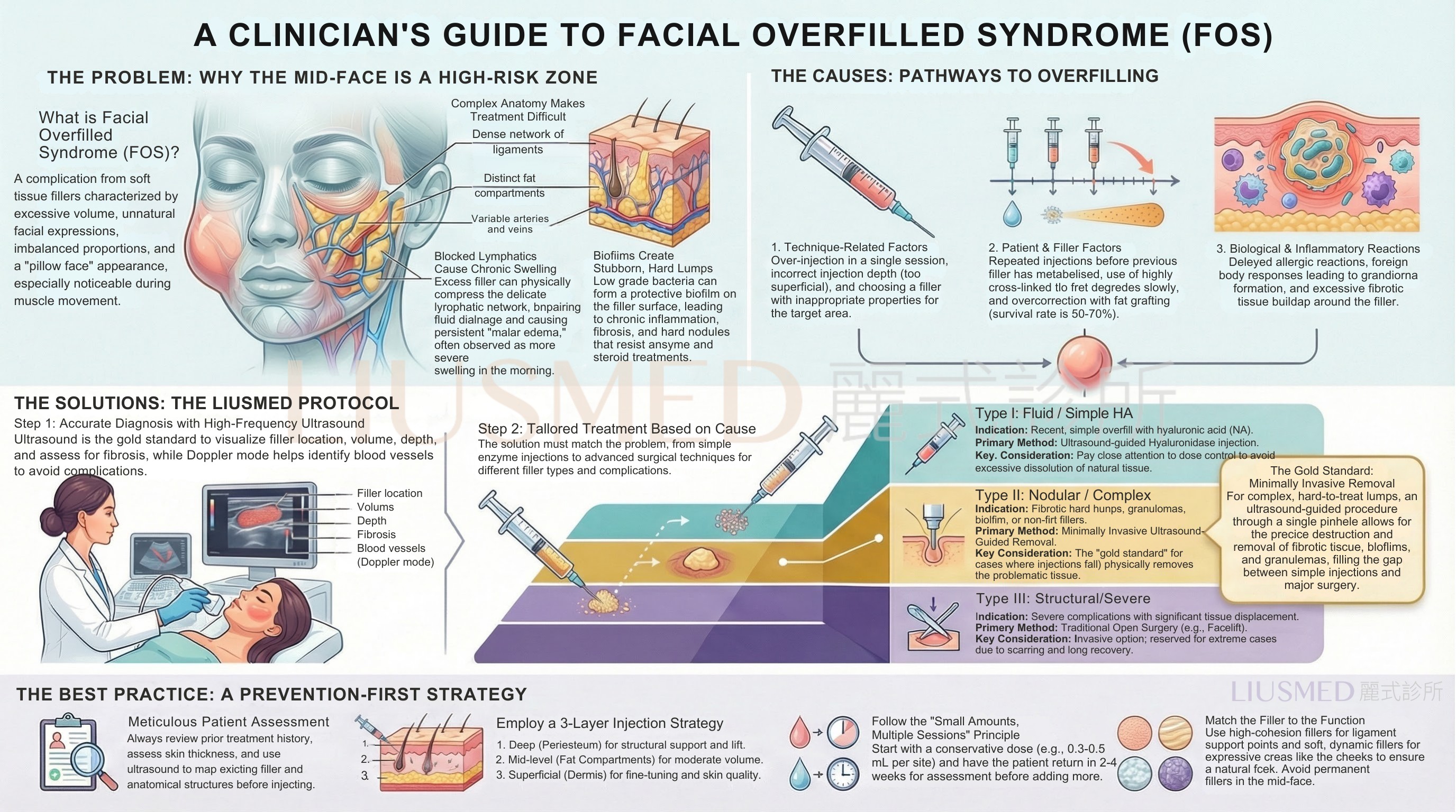 麗式クリニックは長年の臨床経験に基づき、FOS(顔面過剰充填症候群)の包括的な診断・治療ガイドラインを整備しました。画像をクリックで拡大表示。