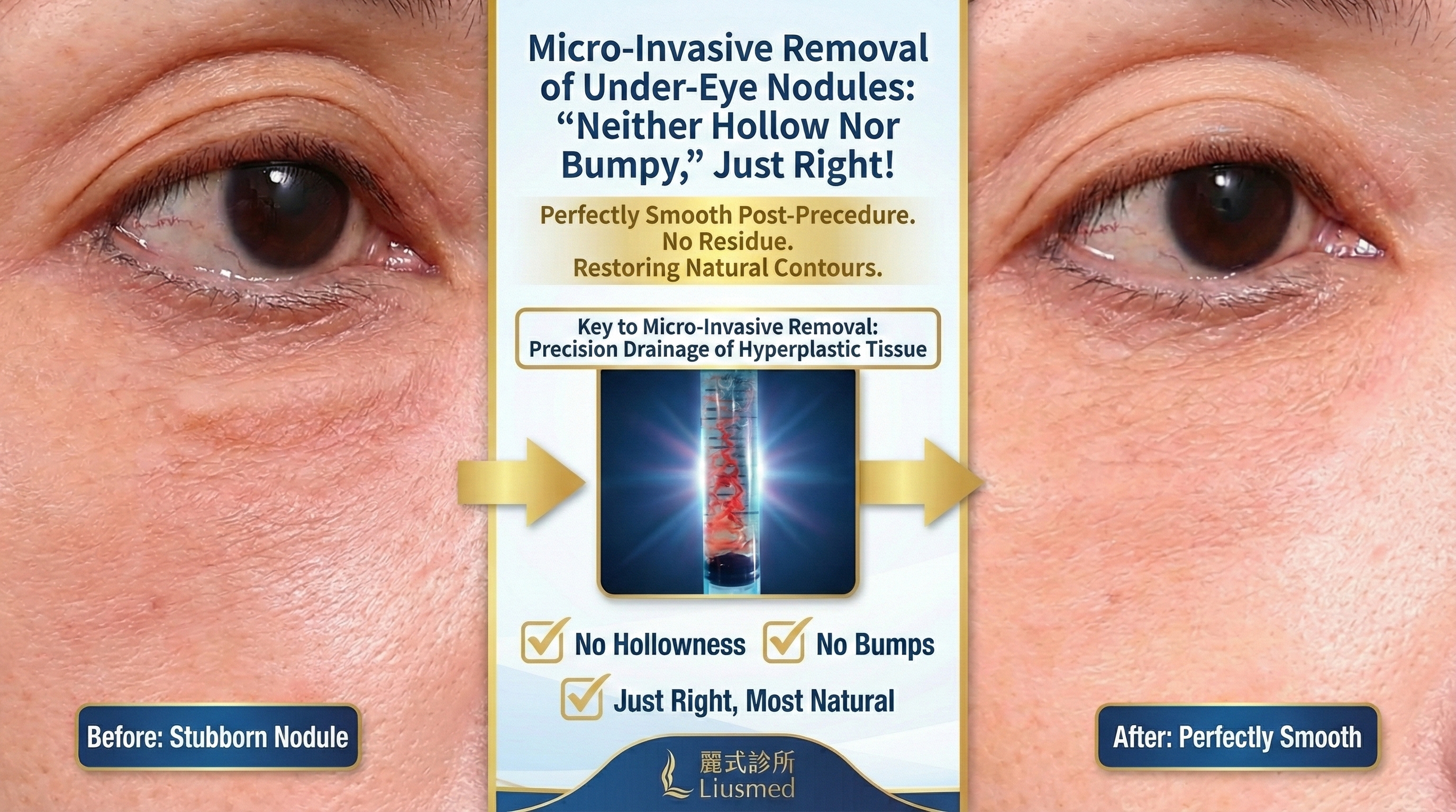涙袋充填後に形成された頑固な結節、多くの医師に異なる答えを言われました。微創ピンホール摘出術で、ついに平らで自然な目の下のラインを取り戻しました。