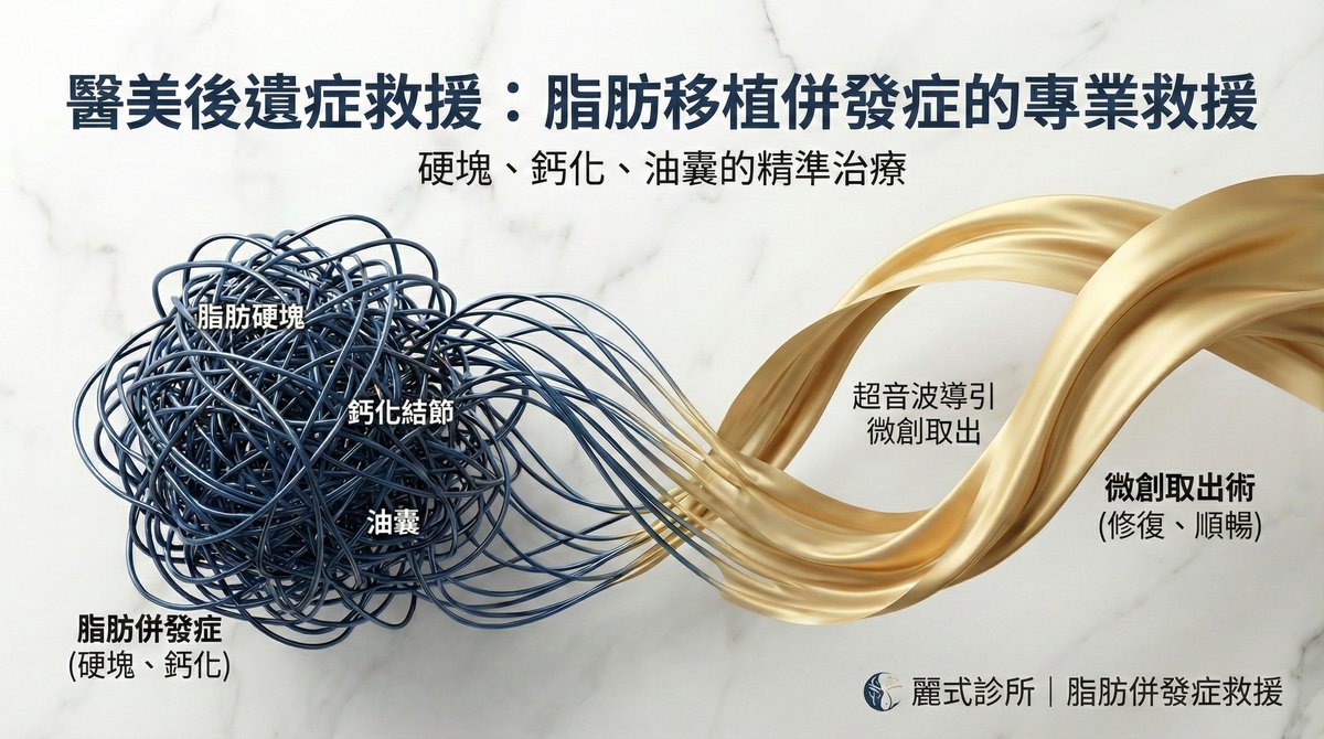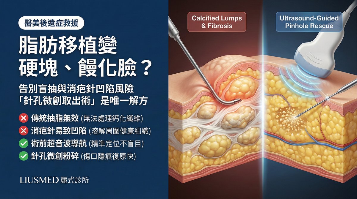 自體脂肪移植雖然使用自身組織,但併發症同樣棘手——饅化臉(FOS)、鈣化硬塊、眼下脂肪肉芽腫(毛毛蟲狀凸起)等問題,傳統抽脂或類固醇注射往往無法解決。麗式診所劉達儒醫師專精超音波導引「針孔微創取出術」,透過僅 1-2mm 的微創傷口精準移除纖維化脂肪團塊,無需動大刀即可恢復自然輪廓。