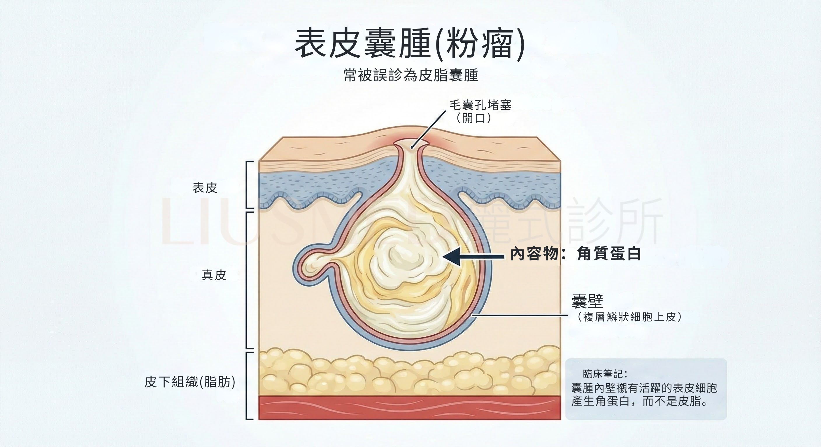 粉瘤位於皮膚淺層,由角質細胞形成囊壁,內含角質代謝物