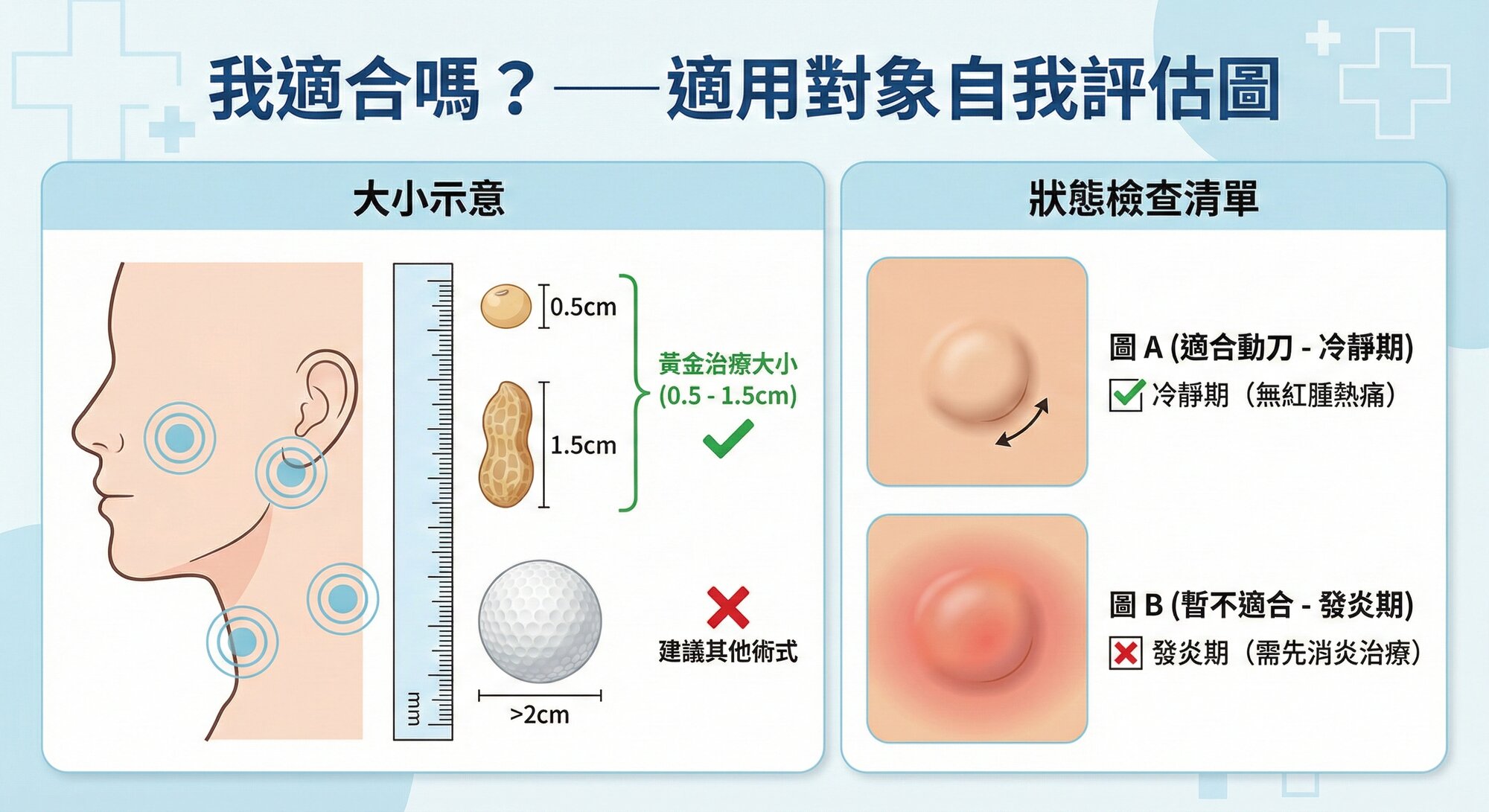 囊腫處於冷靜期,沒有紅腫熱痛(發炎會導致囊壁脆化,難以完整取出)