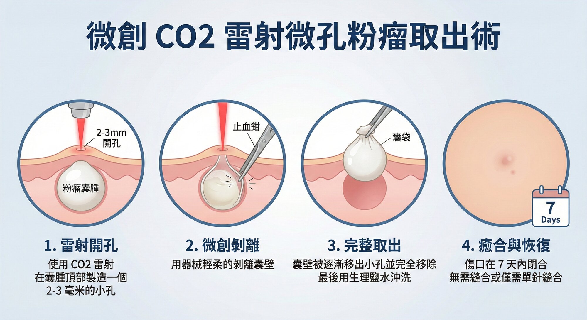 針對臉部或頸部 0.5-1.5 公分的中小型粉瘤,麗式診所劉達儒醫師採用「CO2 雷射微孔取出術」。利用雷射精準打出僅 2-3mm 的微小圓孔,取代傳統手術刀切口,在幾乎不出血的狀態下完整剝離並取出囊壁。術後不需縫合(或僅需一針),癒合後僅留極淡的痘疤狀痕跡,大幅提升美觀度。
