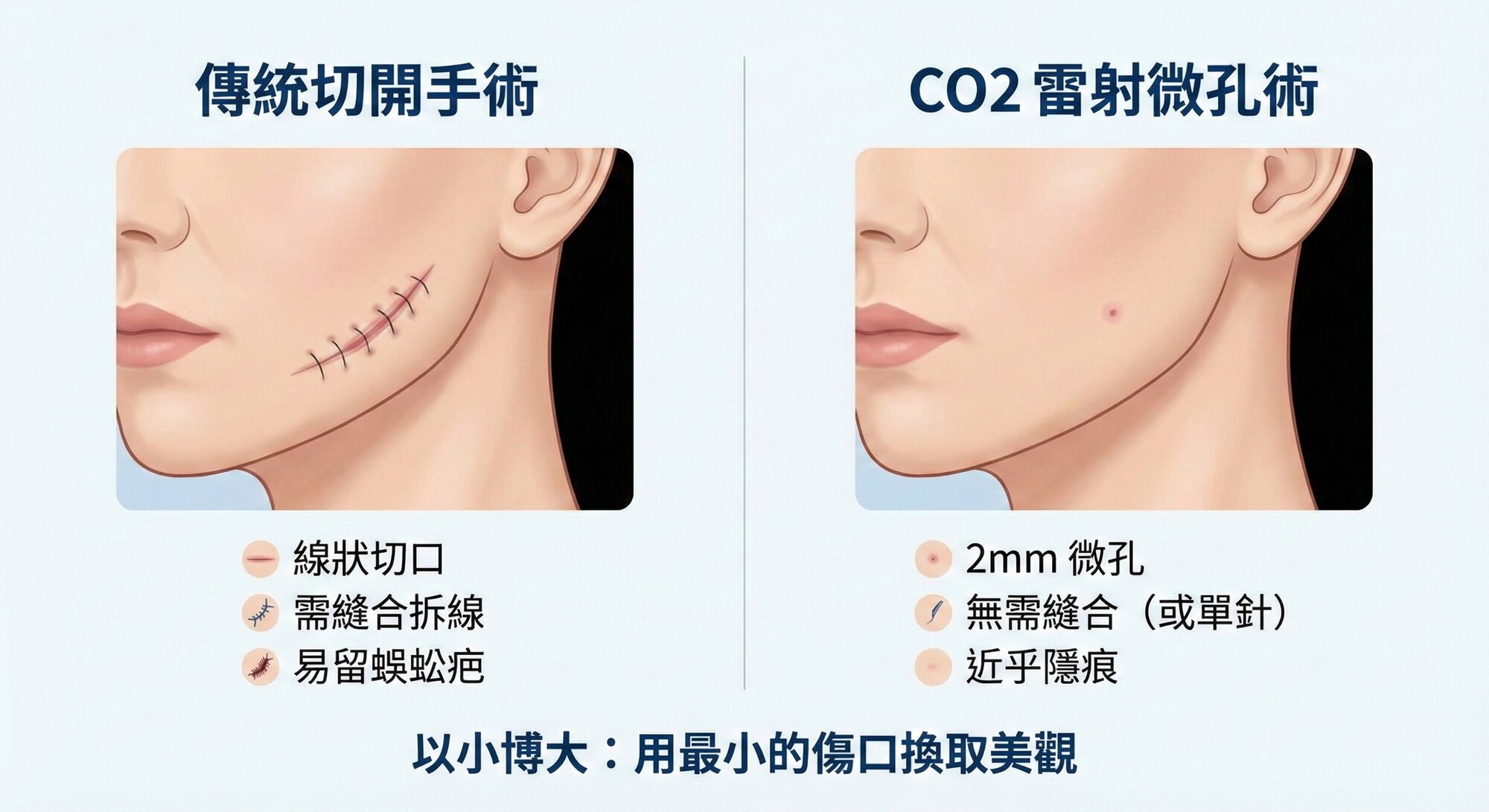 傳統手術會留下一條線狀疤痕,若醫師縫合張力處理不好,還會變寬。雷射微孔術後,通常只會留下一個極淺的凹痕,癒合後外觀類似一個淡化的痘疤,在臉部幾乎不被注意。