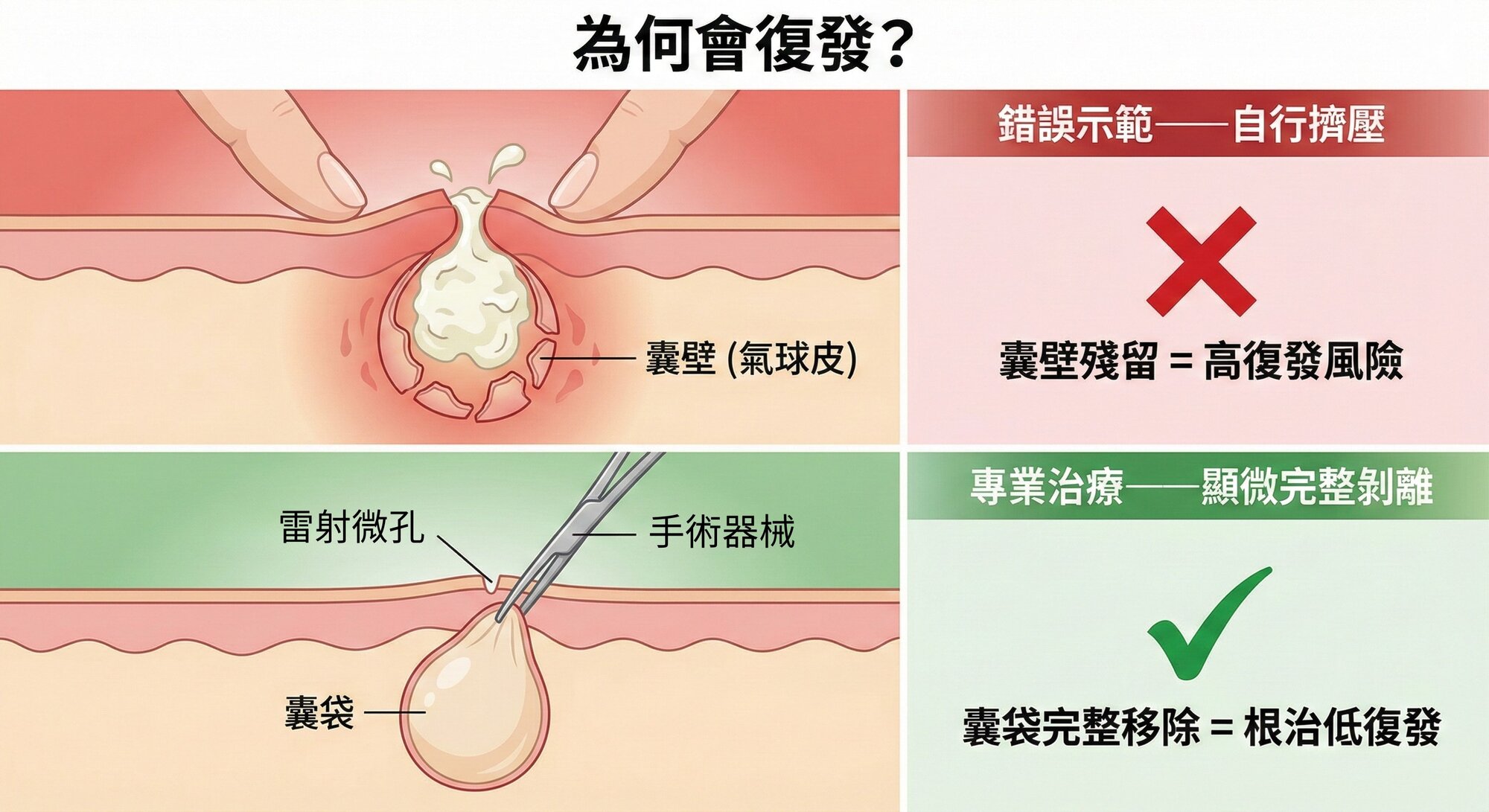 千萬不要!自己擠壓通常只能擠出內容物(皮脂),「囊壁」依然留在裡面,很快就會再長出來。而且擠壓過程容易將細菌推入深層,引發嚴重蜂窩性組織炎,導致將來手術範圍變大、疤痕更醜。